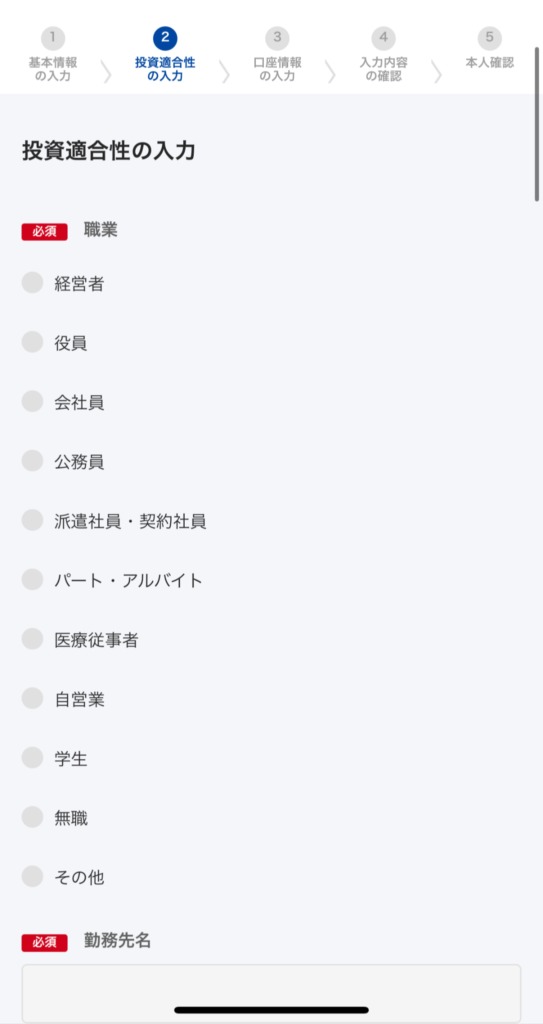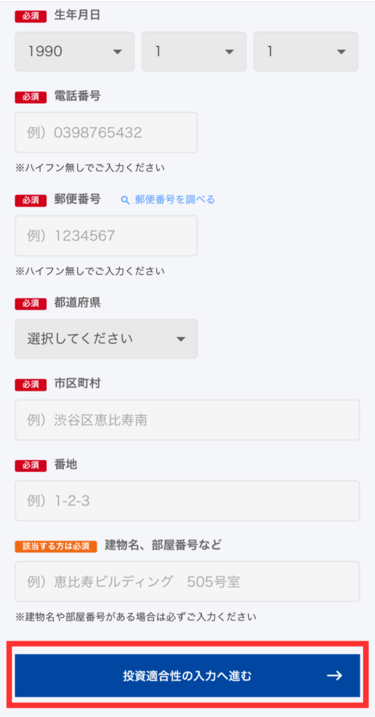 質問に回答し、全て回答したら「投資適合性の入力へ進む」