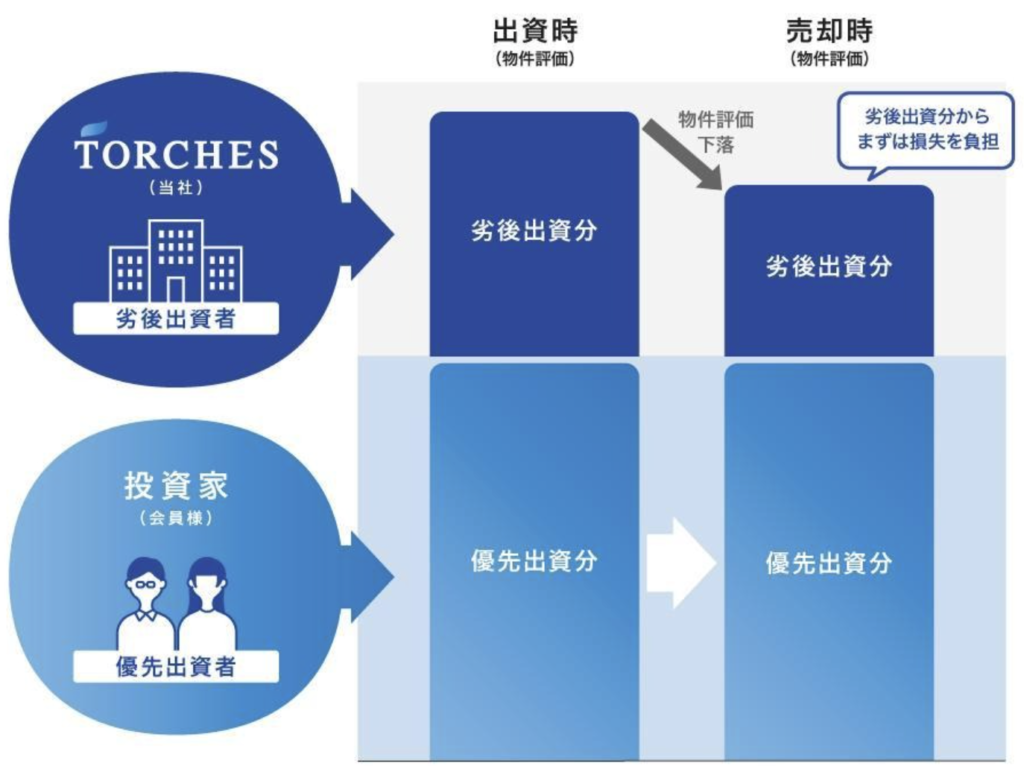 トーチーズでは元本割れのリスクを軽減するために優先劣後出資方式を採用してるよ🌸