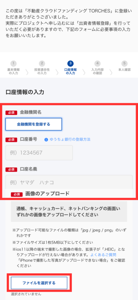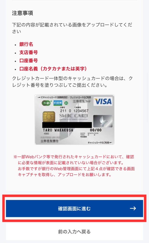 口座情報を入力し画像をアップロードする 完了後、「確認画面に進む」
