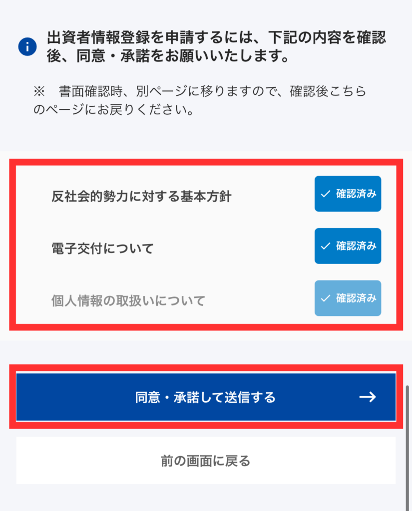 入力内容を確認し、それぞれの書面にチェックして「同意・承認して送信する」
